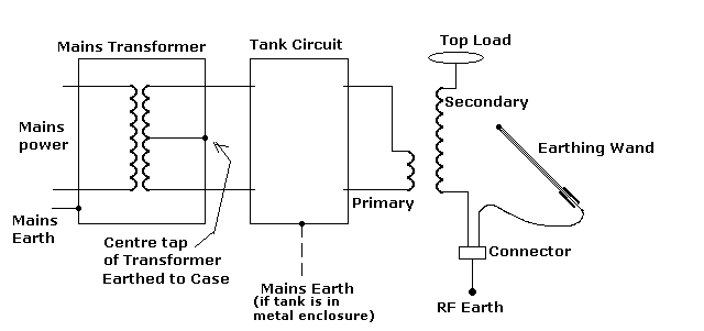 The tank circuit may be a simple spark gap right through to a full blown electronic circuit with IGBT's, if there are any exposed metal parts, they should be mains earthed or insulated from touch.