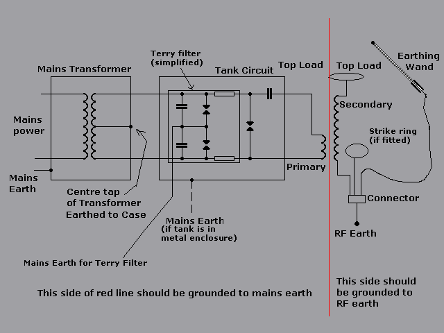 This diagram has been modified to include a simplified Terry circuit, as you can see it is centre tapped, it's that part which needs to be grounded to the mains side, in fact i have placed a red line, that should make things clearer.